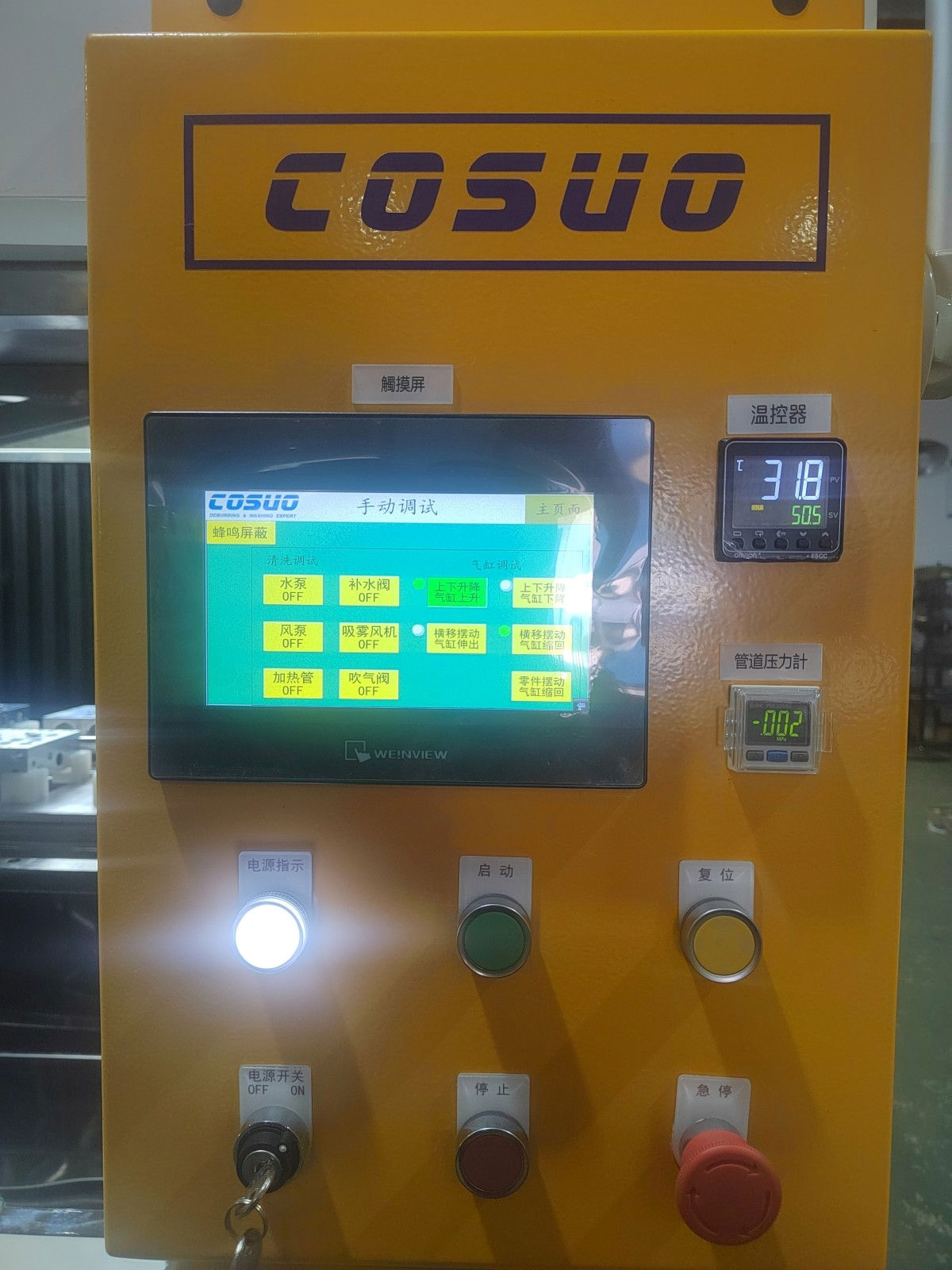 8.备有明确的指示灯显示设备运转,A、绿灯:设备正常运转B、黄灯:设备休止或其它C、红灯:设备异常或故障