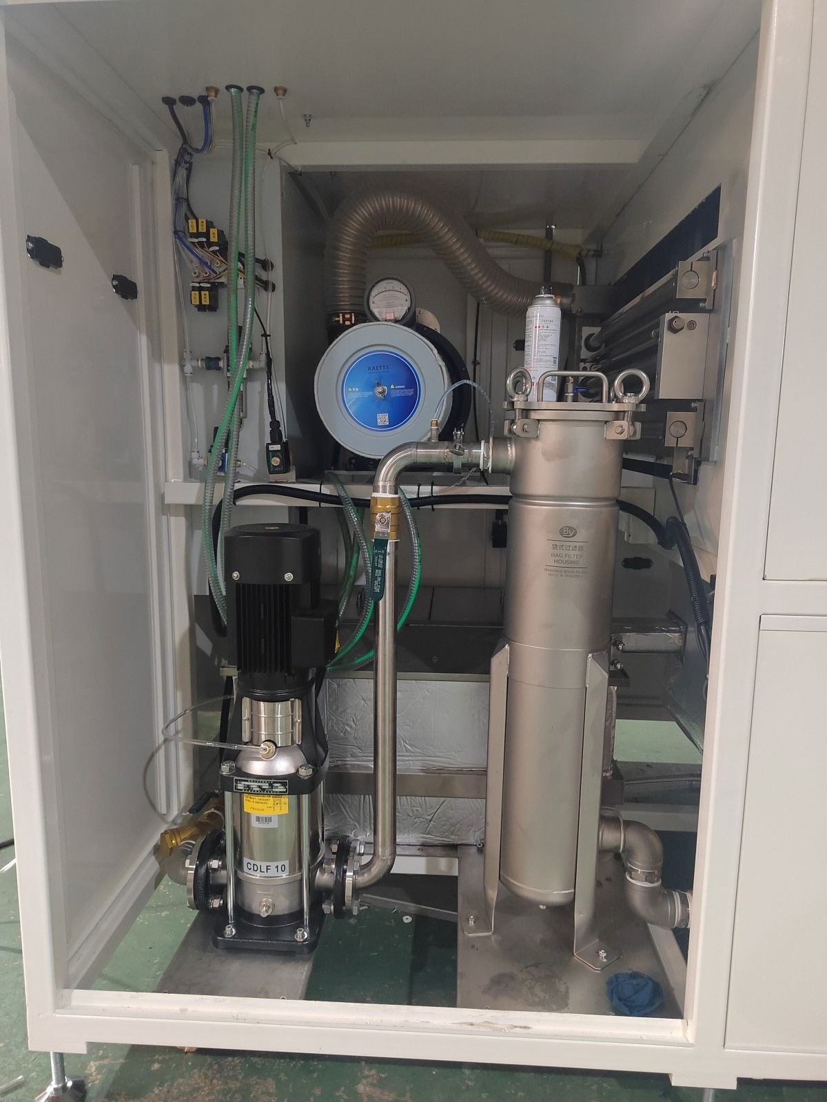1.清洗系统、漂洗系统采用“南方”泵、“碧云”袋式过滤器、可调快拆喷嘴、不锈钢管路、球阀、压力表等组成。