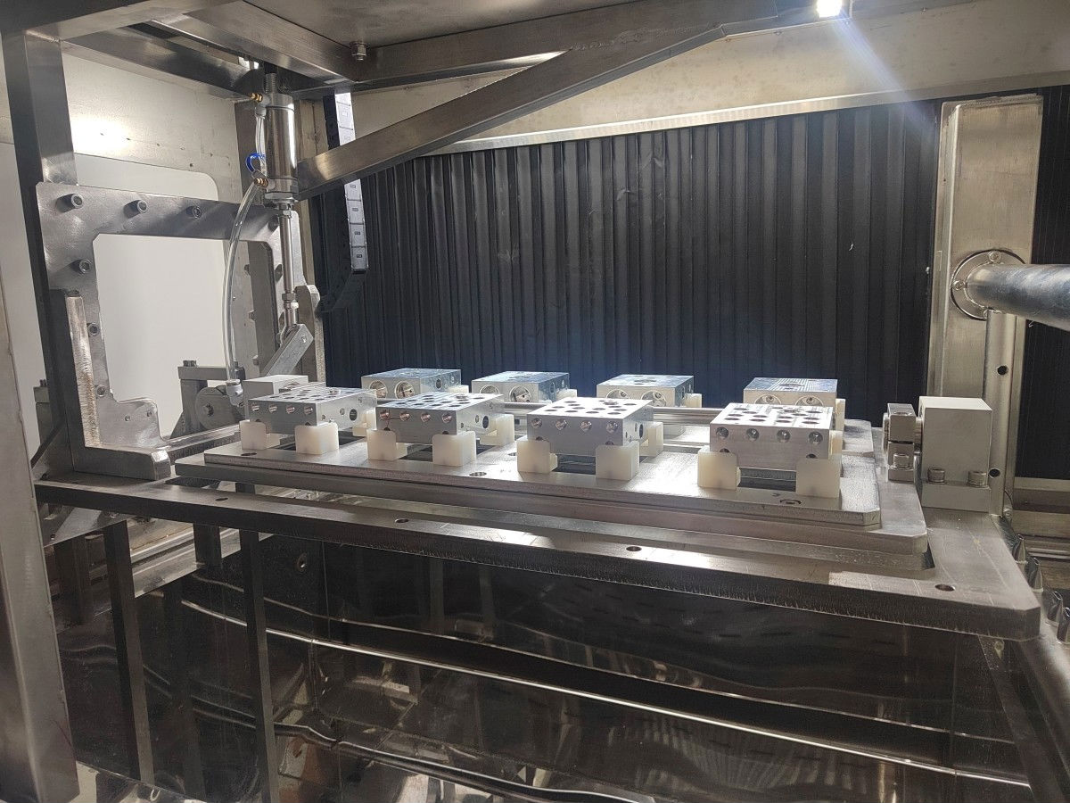 操作者把工件放入工装框后,由侧边尼龙块定位工件,按下启动按钮,自动气动门至关闭状态,首先采用喷淋清洗+摆动、浸没紊流清洗,排液经过风切后,在整个清洗过程中扫描清洗与扫描切水由无杆气缸带动喷淋管/切风管对工件扫描式动作,目的减小能耗和增加清洗/切水面积,使工件得到全面的清洁和干燥。随后人工出料。